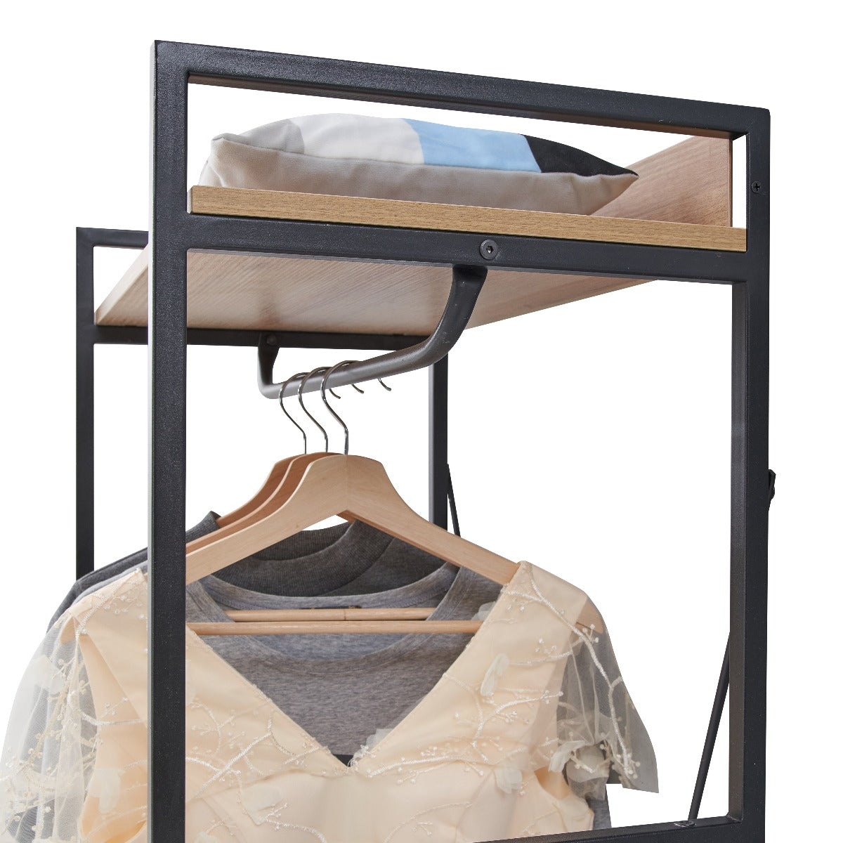 This Claire Open Wardrobe offers open storage and features a Light Oak Finish with Metallic Frames. This item includes a rail for hanging your shirts, suits, or dresses with an additional 2 drawers and 1 shelf for extra storage.